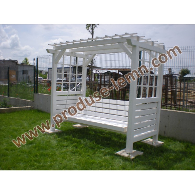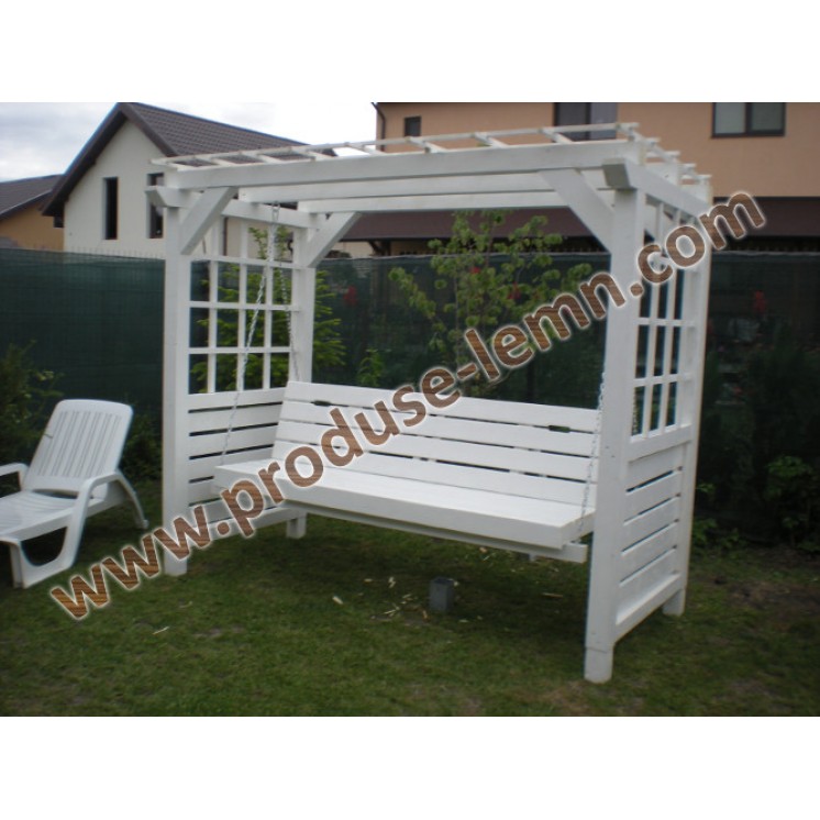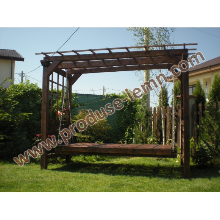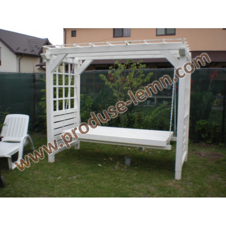 Balansoar din lemn cu banca ce se poate rabata, transformandu- se intr- un pat. Daca sunteti iubitori de flori , cativa trandafiri urcatori vor pune in valoare pergola din lateralele balansoarului.
